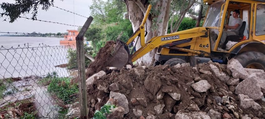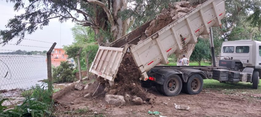 En el predio de la hostería, un equipo municipal volcó camiones de piedras de gran porte y escombros para evitar que se siga socavando el terreno. La tarea continuará en la jornada de este sábado.