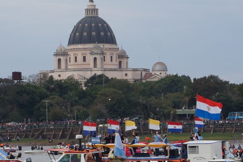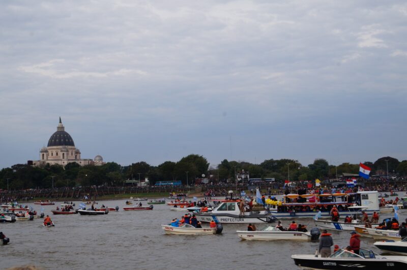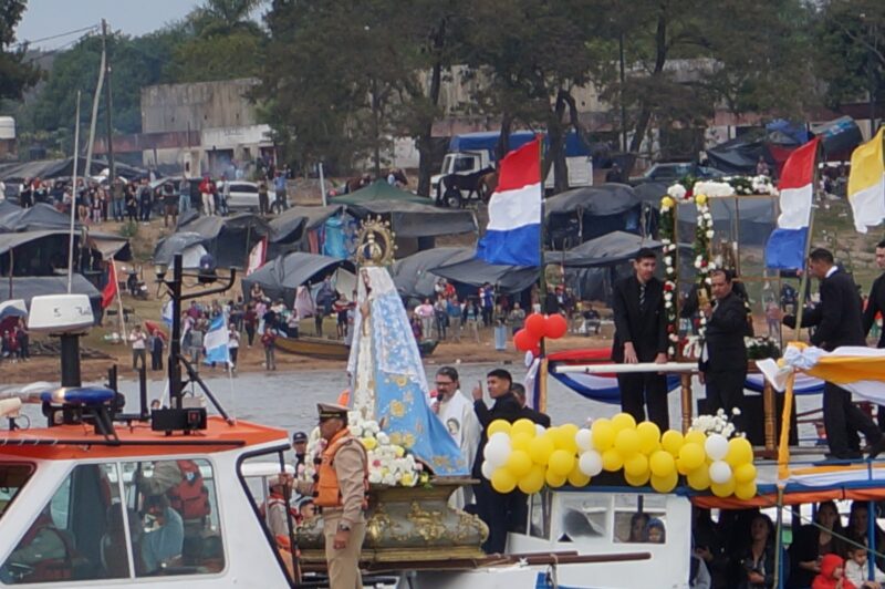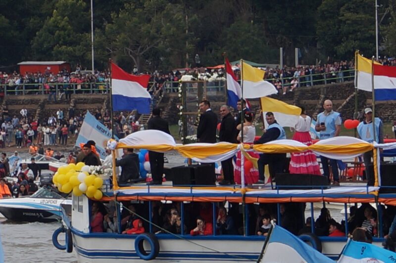 A las 10, la imagen de la Virgen partió desde el santuario hacia la costa del río, donde se embarcó y se produjo el emotivo encuentro con la Virgen de Caacupé del Paraguay.