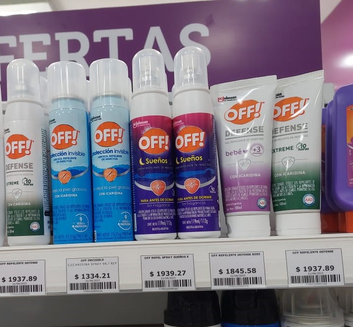 En cuanto a los precios, se puede dar como referencia algunos: off repelente defense crema a 1.937 pesos, en el caso que sea para bebé: 1.845 pesos; off spray sueños: 1.939 pesos; con icardina spray: 1.334 pesos.