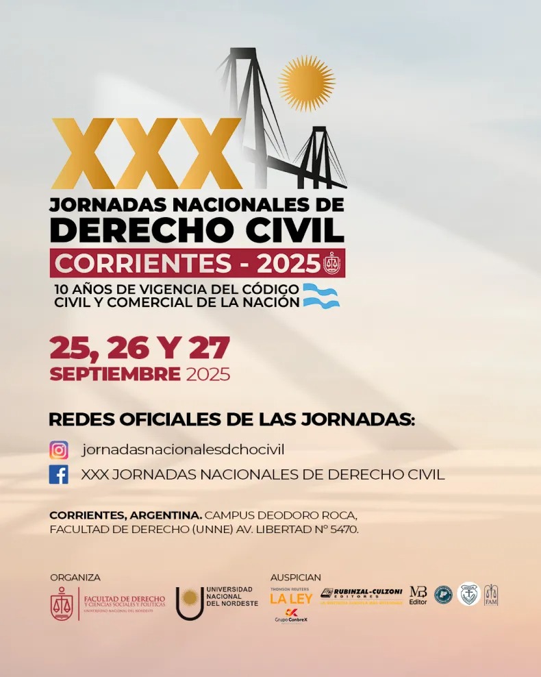 Con el lema, a «10 años de vigencia del Código Civil y Comercial de la Nación», el Departamento de Derecho Privado de la Facultad de Derecho y Ciencias Sociales y Políticas de la Universidad Nacional del Nordeste (UNNE) anuncia la realización del mega evento que tendrá lugar los días 25, 26 y 27 de septiembre de 2025 en el Campus Deodoro Roca, ubicado en Av. Libertad Nº 5470, Ciudad de Corrientes.