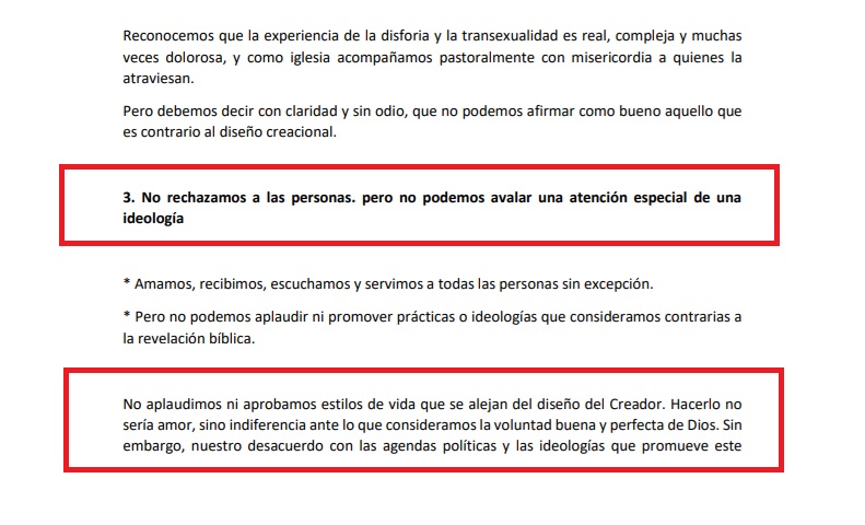 Sin embargo, el tono cambia radicalmente al abordar las discusiones de género. La declaración ratifica la visión bíblica de la binariedad (hombre y mujer) como un «diseño divino» y cierra la puerta a cualquier validación de la ideología de género. «No podemos afirmar como bueno aquello que es contrario al diseño creacional», sostienen, aclarando que, aunque acompañan pastoralmente el dolor de la disforia, no consideran la transexualidad como normativa.