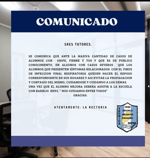 La rectoría de la Escuela Técnica Valentín Virasoro de Goya, informó que “ante la masiva cantidad de casos de alumnos con gripe, fiebre y tos y que es de público conocimiento, en algunos con casos severos que los alumnos que presenten síntomas relacionados con el virus de infección viral respiratoria queden hacer el reposo correspondiente en sus hogares y así evitar la propagación y contagio del mismo”.