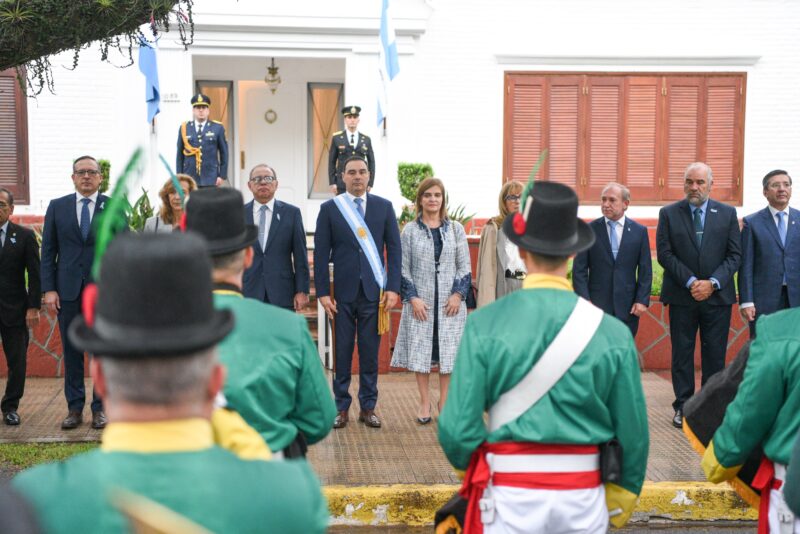 La comitiva gubernamental encabezada por Gustavo Valdés participó a las 8, del Toque de Diana a cargo de la banda musical de los Cazadores Correntinos frente a la residencia oficial en la costanera norte General San Martin, con el rio Paraná como telón de fondo.