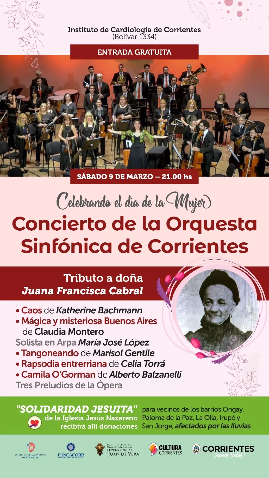 El Instituto de Cultura de Corrientes invita al concierto que la Orquesta Sinfónica de la Provincia, dirigido por la maestra Andrea Fusco, brindará hoy a las 21, en el Instituto de Cardiología ubicado en Bolívar 1334. Este espectáculo que contará con entrada libre y gratuita, se realizará en homenaje a las mujeres en su día.