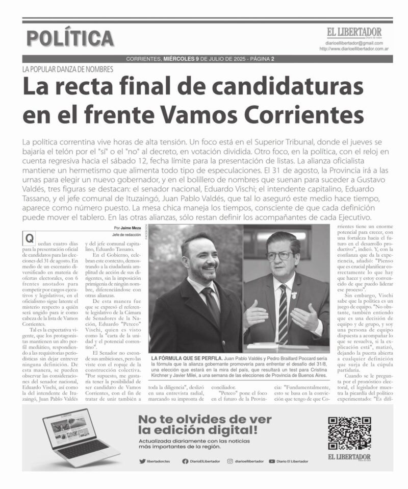 La política correntina vive horas de alta tensión. Un foco está en el Superior Tribunal, donde el jueves se bajaría el telón por el «sí» o el «no» al decreto, en votación dividida. Otro foco, en la política, con el reloj en cuenta regresiva hacia el sábado 12, fecha límite para la presentación de listas. La alianza oficialista mantiene un hermetismo que alimenta todo tipo de especulaciones. El 31 de agosto, la Provincia irá a las urnas para elegir un nuevo gobernador, y en el bolillero de nombres que suenan para suceder a Gustavo Valdés, tres figuras se destacan: el senador nacional, Eduardo Vischi; el intendente capitalino, Eduardo Tassano, y el jefe comunal de Ituzaingó, Juan Pablo Valdés, que tal lo aseguró este medio hace tiempo, aparece como número puesto. La mesa chica maneja los tiempos, consciente de que cada definición puede mover el tablero. En las otras alianzas, sólo restan definir los acompañantes de cada Ejecutivo.