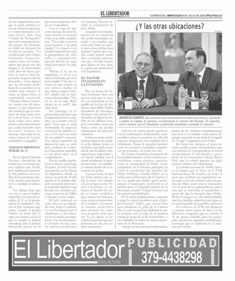 Pero la baraja de Vamos Corrientes tiene una tercera carta que se mezcla con insistencia en los pasillos de la Casa de Gobierno: Juan Pablo Valdés, intendente de Ituzaingó. Hermano del actual Gobernador. Su figura ha crecido en los últimos tiempos y su nombre suena con fuerza como un posible continuador del proyecto oficialista.