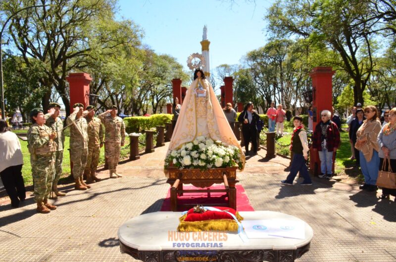 Además de la misa por las familias a media mañana y de la procesión y misa por la tarde, ese momento extraordinario mencionado tuvo por protagonistas a los miembros de la fuerza militar, en cuya ceremonia la Asociación Belgraniana de Mercedes hizo entrega de una joya única a la imagen histórica de Nuestra Señora de las Mercedes, Patrona de esta población mediterránea correntina.