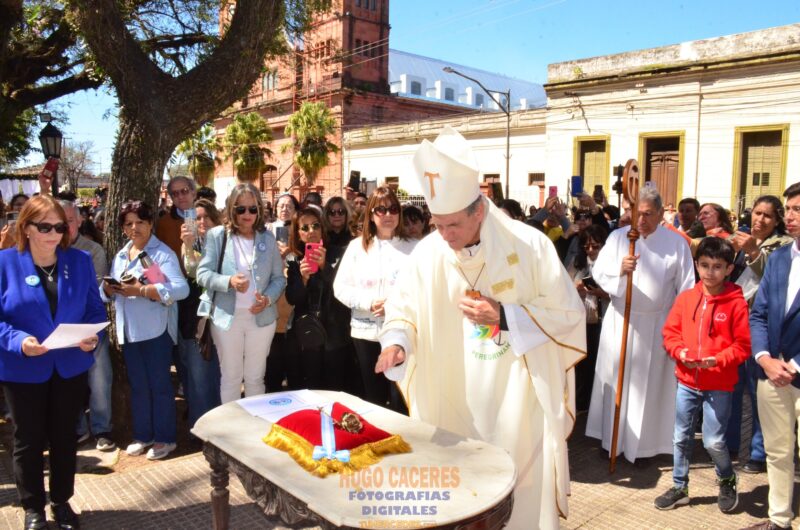 La pieza, «símbolo de reconciliación y esperanza», fue bendecida por el obispo, monseñor Adolfo Ramón Canecín tras presidir la celebración eucarística matutina, también en el día que cumplió 10 años la frente al gobierno pastoral de la Diócesis de Goya, rosa que se depositó entre las manos de la imagen de la Virgen durante la Rendición de Honores del Ejército Argentino en la plaza, frente al templo parroquial. Allí, con la ejecución de la Banda Militar Fuerte Sancti Espíritu, se entonó el Himno Nacional mientras la sagrada imagen recibía la custodia de honor de los hombres de la heroica institución de la Nación, tras lo cual con fervor entonaron la canción del Ejército Argentino.