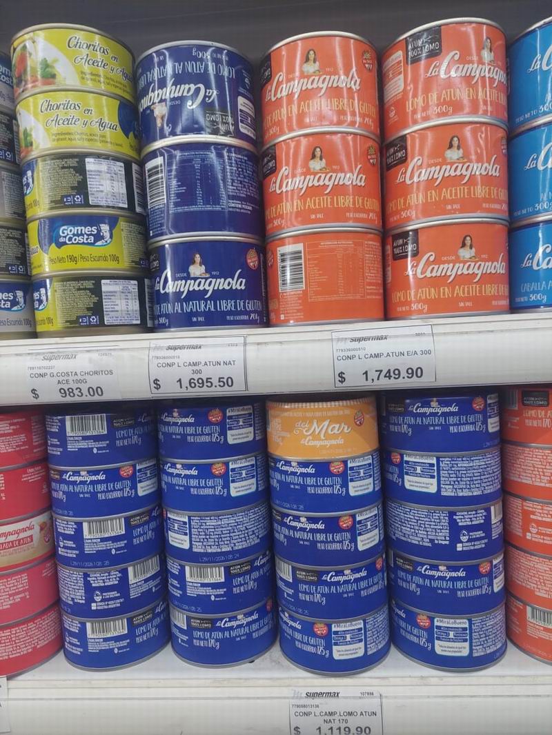 Por su parte, el kilo de cerdo, está casi 1.500 pesos, aunque se pueden conseguir tres bifes a 615 pesos. Las latas de atún están de 900 a más de 1.700 pesos.