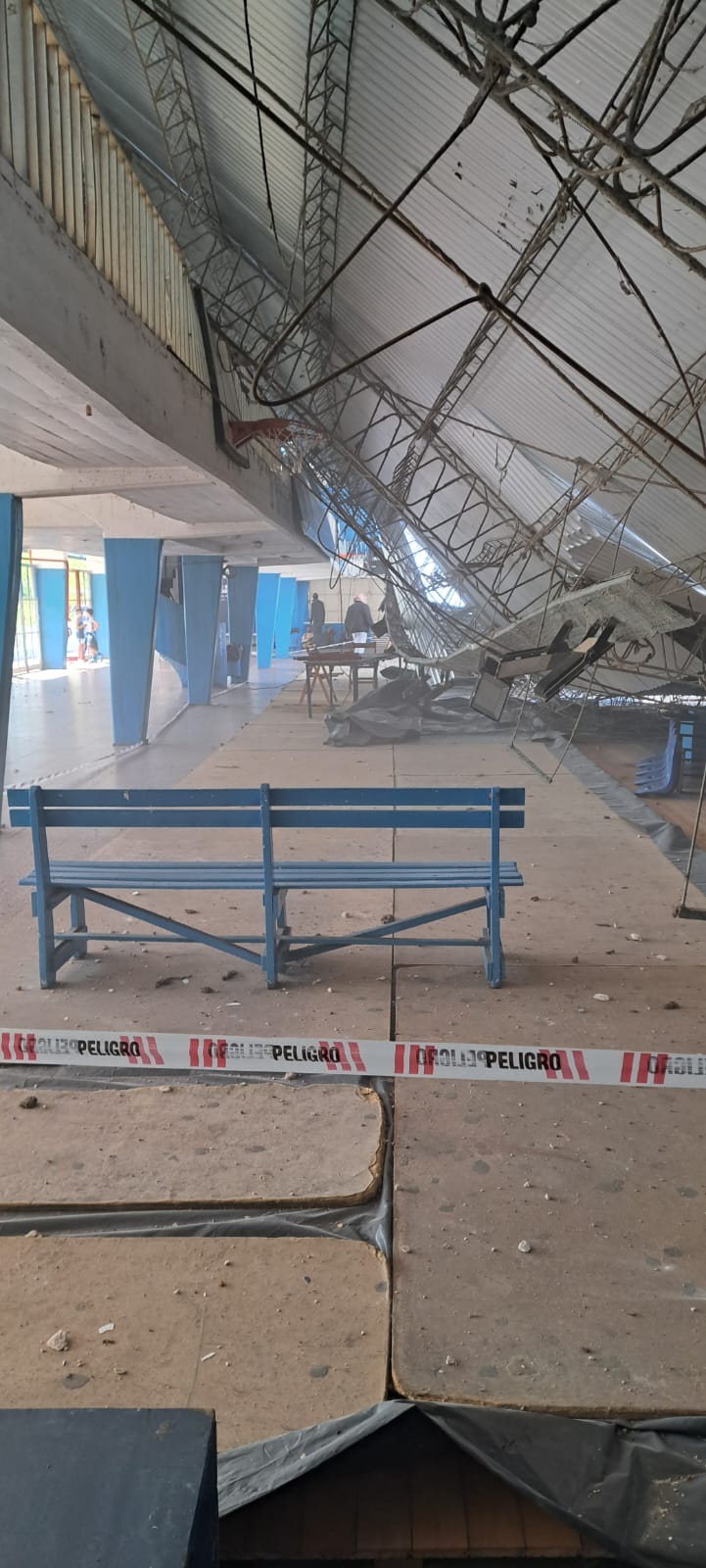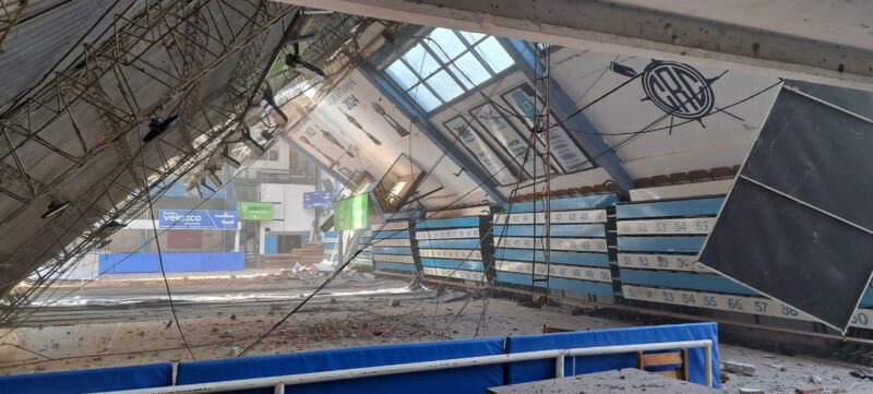 A su vez, detalló que “parece que se rajó la pileta también y se cayó todo el muro del costado. Por suerte todos bien, no hay heridos, no había nadie en el estadio. Se ve que el muro no aguantó el peso de las chapas, y se cayó”.