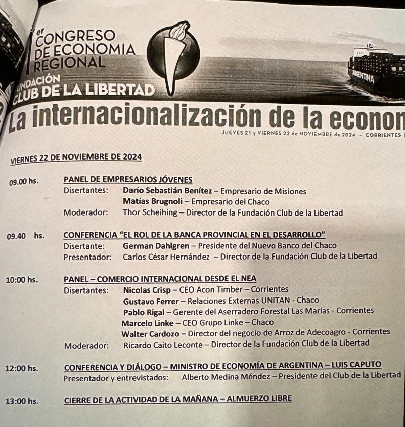 El cierre será con la Conferencia y diálogo-ministro de Economía de Argentina-Luis Caputo. Presentador y entrevistados: Alberto Medina Méndez-Presidente del Club de la Libertad.