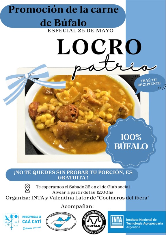 Este sábado 25, se cumple un nuevo aniversario de la Revolución de Mayo en la Argentina, y a los actos oficiales se le suman las comidas típicas. Así, el Instituto Nacional de Tecnología Agropecuaria (Inta) Corrientes propone un gran locro patrio, pero de búfalo, en Caá Catí.
