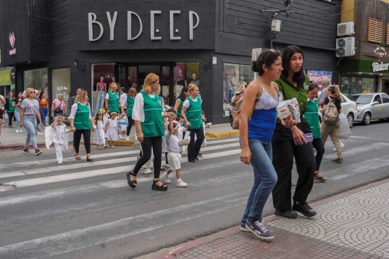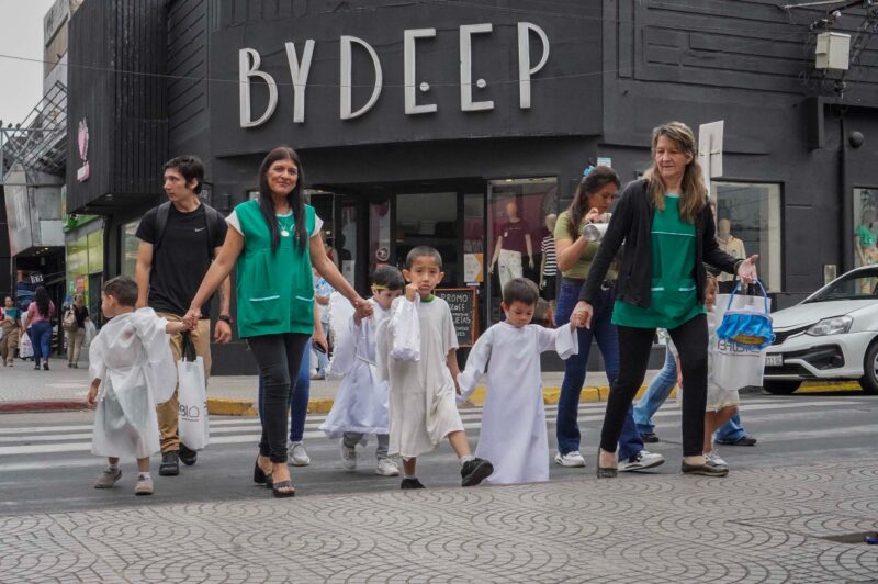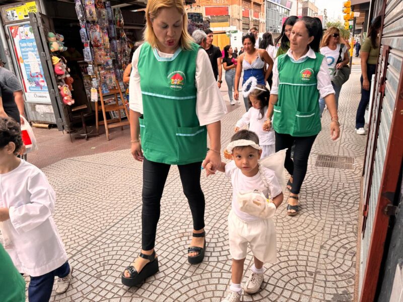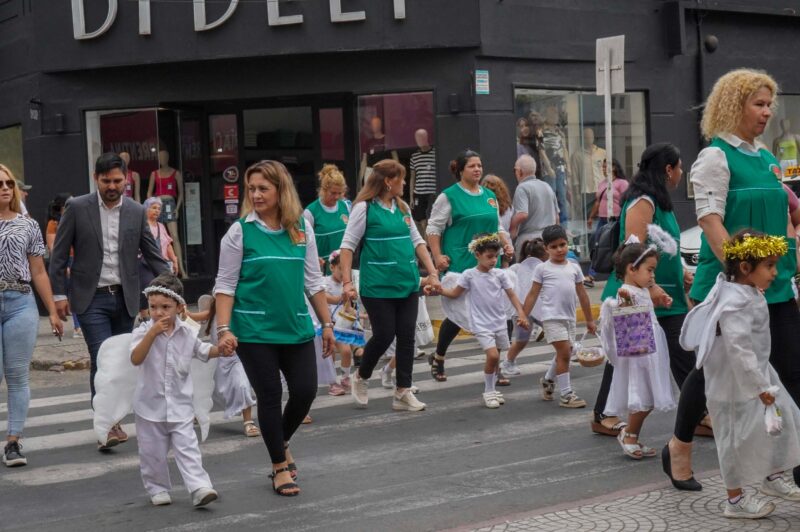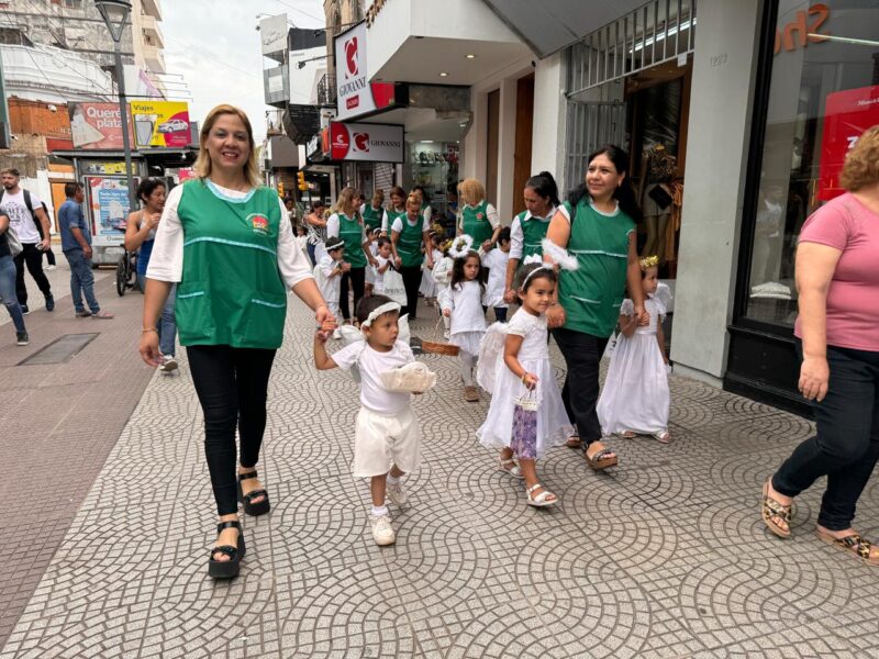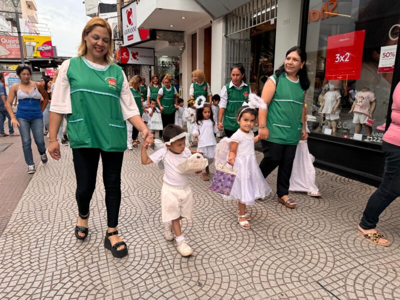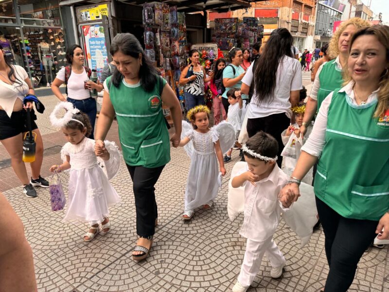 Pequeños jardineritos de Mitaí Roga del CDI barrio Pupular y Virgen de Guadalupe desfilaron desde muy temprano por la peatonal Junín para continuar con la tradición de la celebración de Ángeles Somos. Por su paso derramaban ternura con sus atuendos blancos, alitas y aureolas.