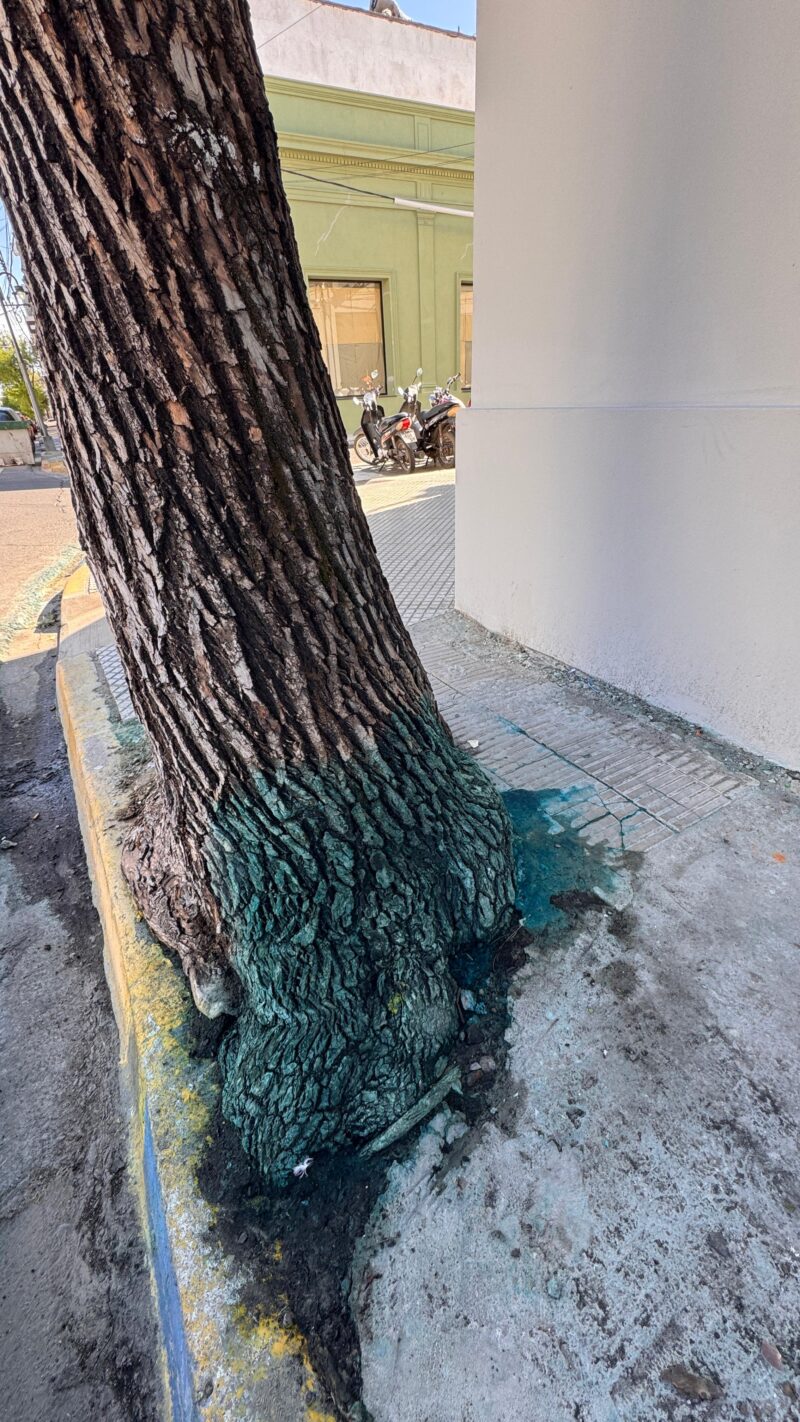 Cristina, puso énfasis en que se puede observar en la vereda, un ejemplar de fresno, al que le habrían colocado en sus raíces un líquido de tinte azul que tendría como finalidad la de “liquidar” al árbol para luego talarlo. Afirmó que el ataque al ejemplar fue premeditado y orquestado por la gente de la empresa. La evidencia es visualmente impactante: «Aparte se perforó el árbol cuidadosamente en su base. Tiene varios agujeros de los cuales tengo fotos», advirtió.