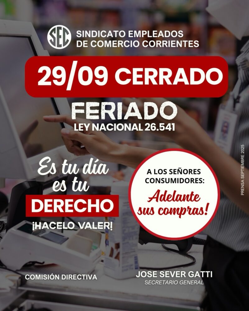 Desde el Sindicato de Empleados de Comercio de Corrientes extendieron el aviso a través de las redes sociales especialmente para advertir a los clientes que adelanten las compras debido a que el lunes no abrirán los locales.