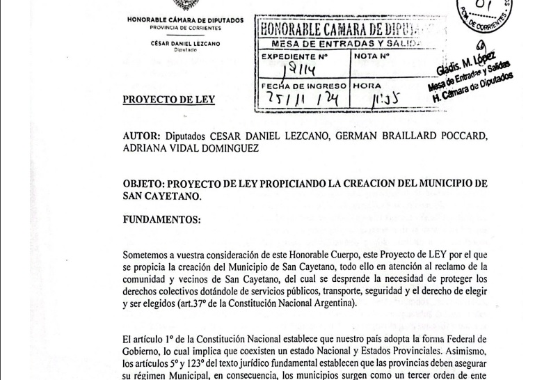 Los diputados del bloque de Unión por la Patria, Germán Braillard, César Lezcano y Adriana Vidal presentaron un proyecto de ley mediante el cual se propone la creación del Municipio de San Cayetano, lo que significaría que esa localidad quedaría separada de Riachuelo.