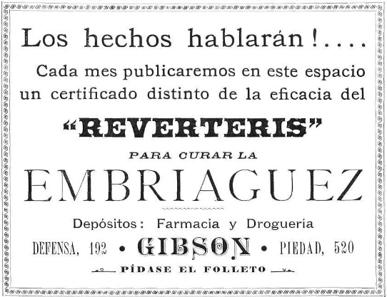 En el mencionado libro se cita, por ejemplo, al de un periódico local de abril de 1902: «Farmacia del Puerto. Se prepara delicioso licor antialcohólico. Regenerador», anunciaba y en la descripción comentaba: «Los que estén dominados por el abominable vicio de la embriaguez y que deseen curarse para evitar la destrucción de órganos vitales, acudan a la Farmacia del Puerto, en Corrientes donde le venderán solo por seis pesos una botella de Regenerador Antialcohólico que con ella se librará del deshonroso vicio. Una sola botella y los efectos son seguros».