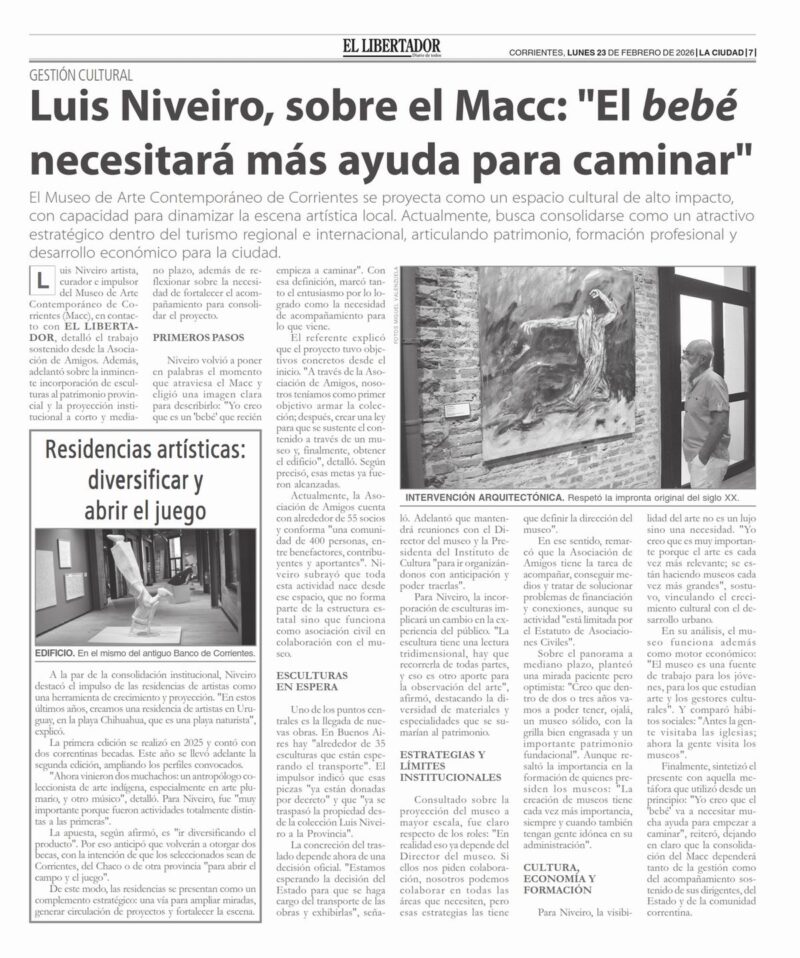 Luis Niveiro artista, curador e impulsor del Museo de Arte Contemporáneo de Corrientes (Macc), en contacto con EL LIBERTADOR, detalló el trabajo sostenido desde la Asociación de Amigos. Además, adelantó sobre la inminente incorporación de esculturas al patrimonio provincial y la proyección institucional a corto y mediano plazo, además de reflexionar sobre la necesidad de fortalecer el acompañamiento para consolidar el proyecto.