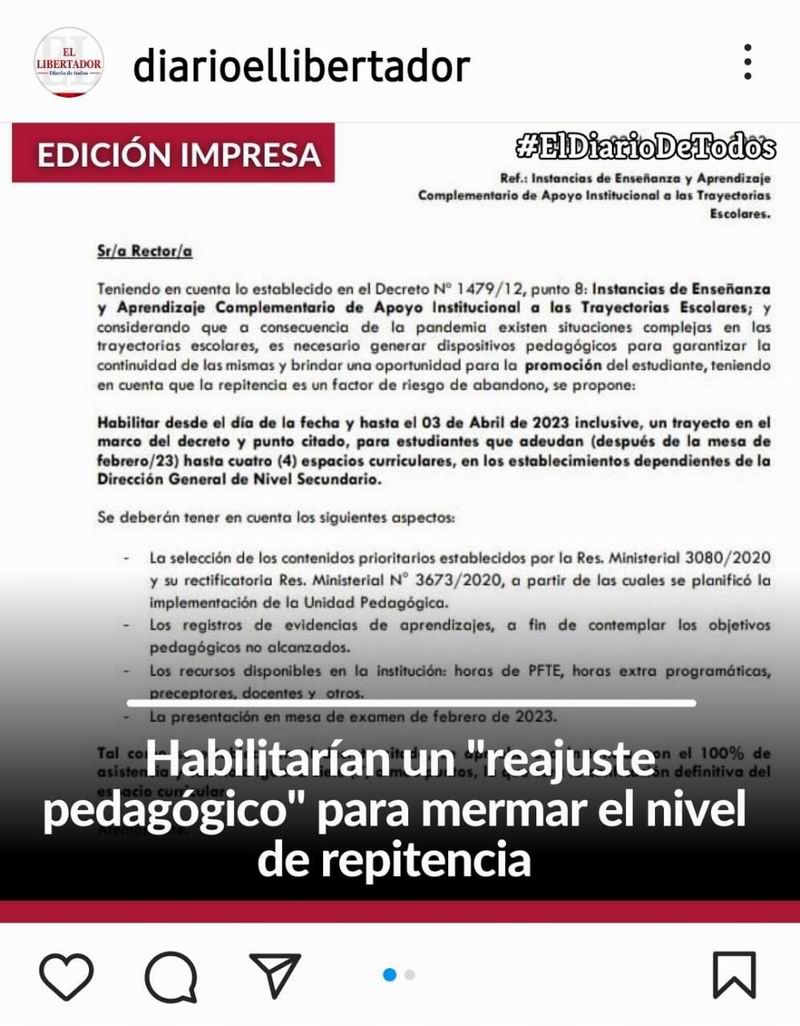 En la edición de ayer del diario EL LIBERTADOR, se publicó la noticia que se refiere que desde el Nivel Secundario se difundió una circular que establecería que aquellos alumnos que no lograron sacar hasta 4 materias previas, podrán concurrir hasta el 3 de abril a un espacio de nivelación que le va a permitir aprobar las materias. En ese período deberán completar el 100 por ciento de asistencia y con nota igual a siete o más puntos. Esta nota se comunicó a todos los rectores para que consideren la forma en que implementarán la oportunidad que se dará a los estudiantes.