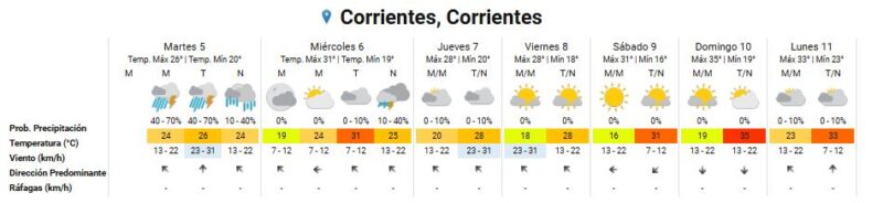 El Servicio Meteorológico Nacional anunció ayer una alerta amarilla por lluvias y tormentas para casi todo el territorio provincial. El área del Norte correntino continúa bajo alerta amarilla, con informe de “tormentas de variada intensidad, algunas localmente fuertes”. Además, adelantaron que “se espera que las mismas estén acompañadas por actividad eléctrica frecuente, ocasional caída de granizo, ráfagas intensas y abundante caída de agua en cortos períodos”.