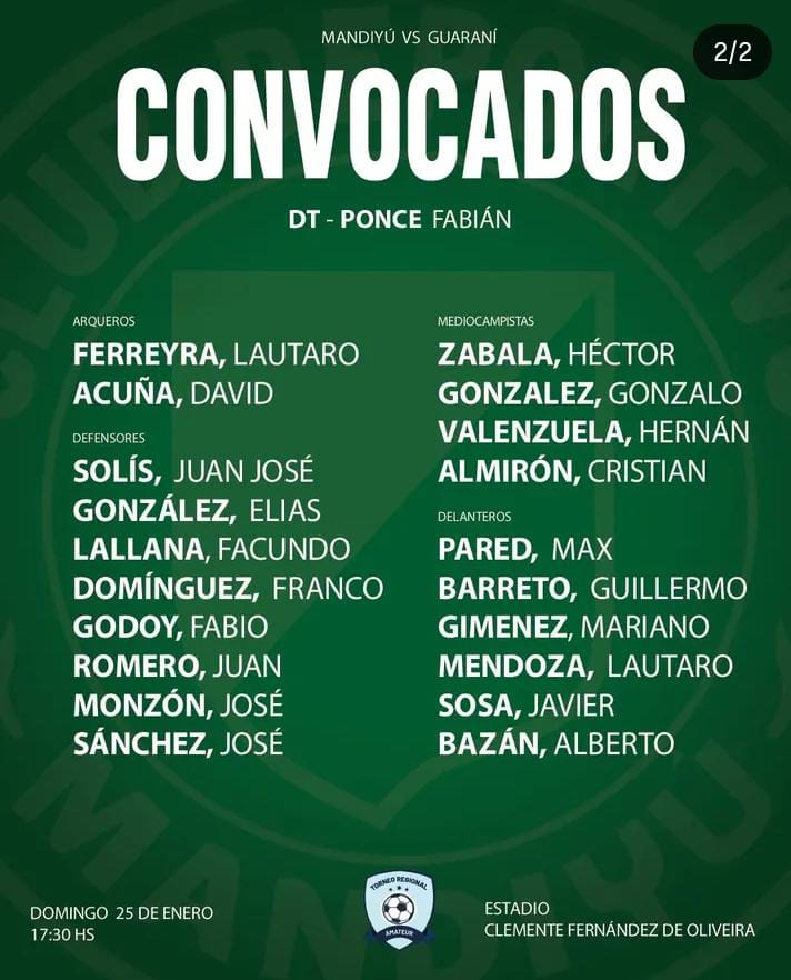Guarani A Franco: Eduardo Flores; Juan A Vallejos, Diego Vallejos o Alejandro Galván, Martín Romero y Lucas Noguera; Lautaro Soto, Derlis Benitez, Enzo Cejas y Enrique Machado; Leonardo Gómez y Mauro Gómez. DT: Manuel Dutto-Juan Eluchans.