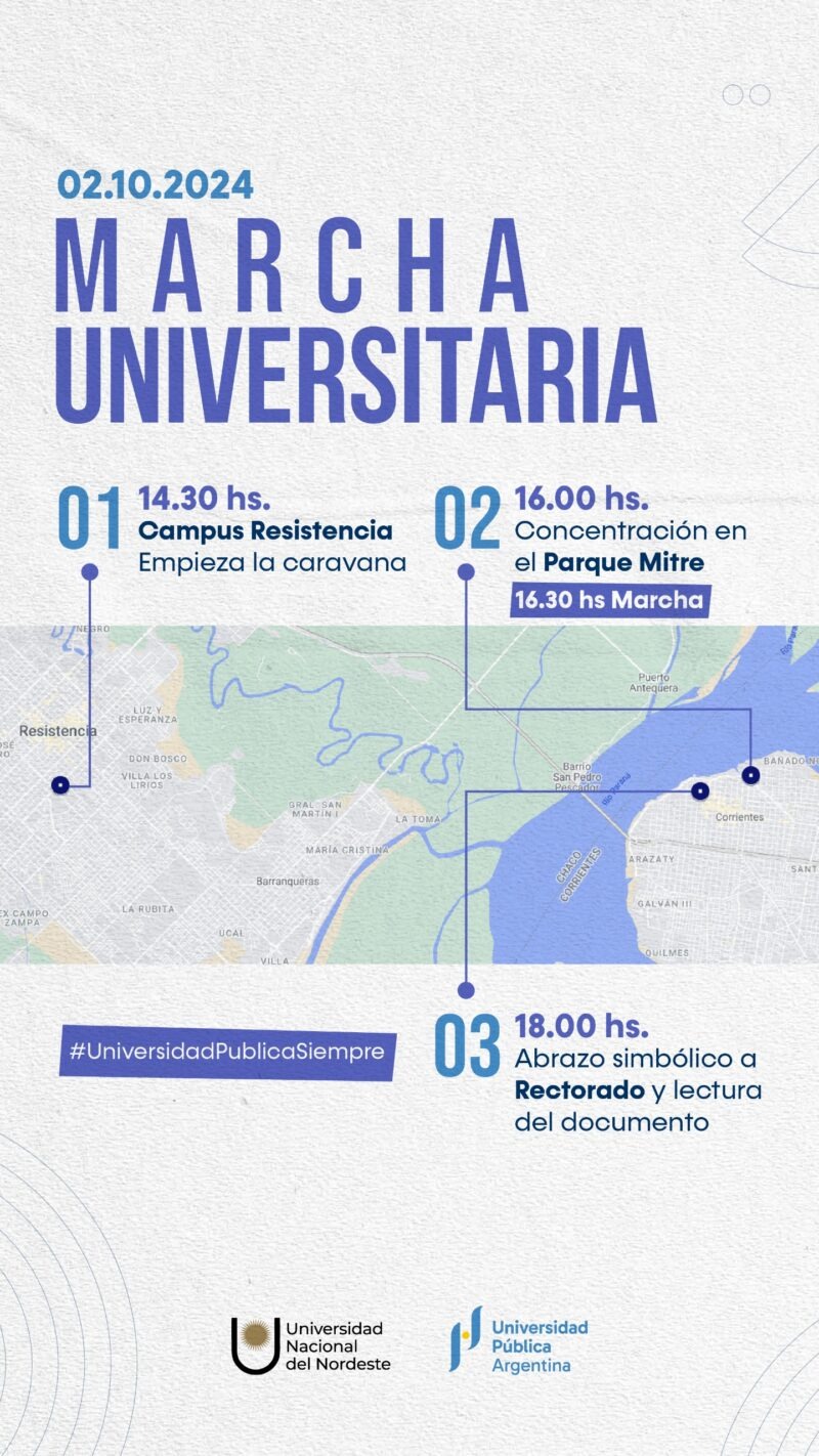Según anticiparon, una vez unidos todos los manifestantes, marcharán por la Costanera hasta la calle Salta. Por dicha arteria céntrica continuará la movilización hasta llegar al Instituto Rectorado de la Unne, donde a las 18 se realizará un abrazo simbólico y se dará lectura al documento.