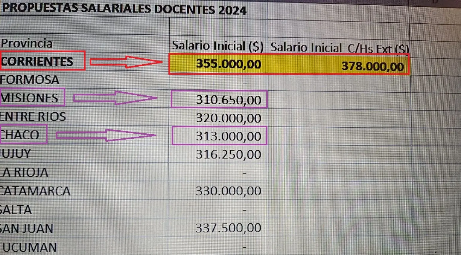 «Tenemos acceso a información de provincias vecinas, tanto del NEA como del NOA, y en todos los casos están trabajando con salarios iniciales menores que los nuestros», aseveró (ver gráfica). Y aseguró que «la Provincia de Corrientes se encuentra primero en la región en el cargo testigo inicial».