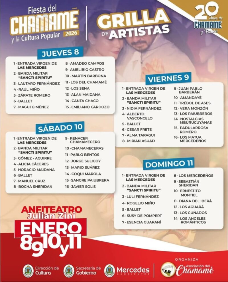 En paralelo, el Anfiteatro Julián Zini será el escenario de cuatro noches de gala (del 8 al 11 de enero) para festejar dos décadas de «Chamamé y Pasión». La grilla de artistas es imponente, destacándose figuras como Emiliano Cardozo el jueves 8, Amandayé y Padularrosa Romero el viernes 9, Bocha Sheridan el sábado 10, y un cierre de lujo el domingo 11 con Ernestito Montiel y Los Ángeles Románticos, entre muchos otros.