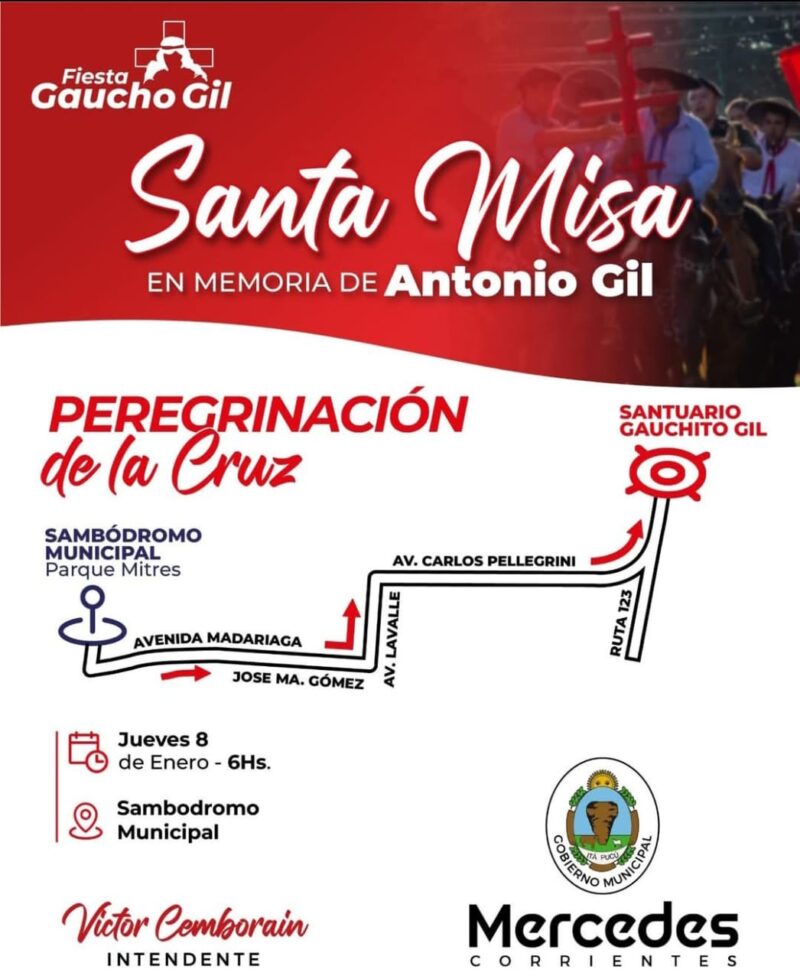 Tras la celebración de la eucaristía prevista para las 6, será el inicio de la tradicional Peregrinación de la Cruz, recorriendo arterias principales como la avenida Madariaga y la avenida Carlos Pellegrini hasta la Ruta 123. Allí, en el nuevo edificio donde se dice asesinaron a Antonio Mamerto Gil Núñez, se recibirá a los jinetes, a las 9 y se realizará otra ceremonia religiosa en memoria de Antonio Gil para todos sus devotos.