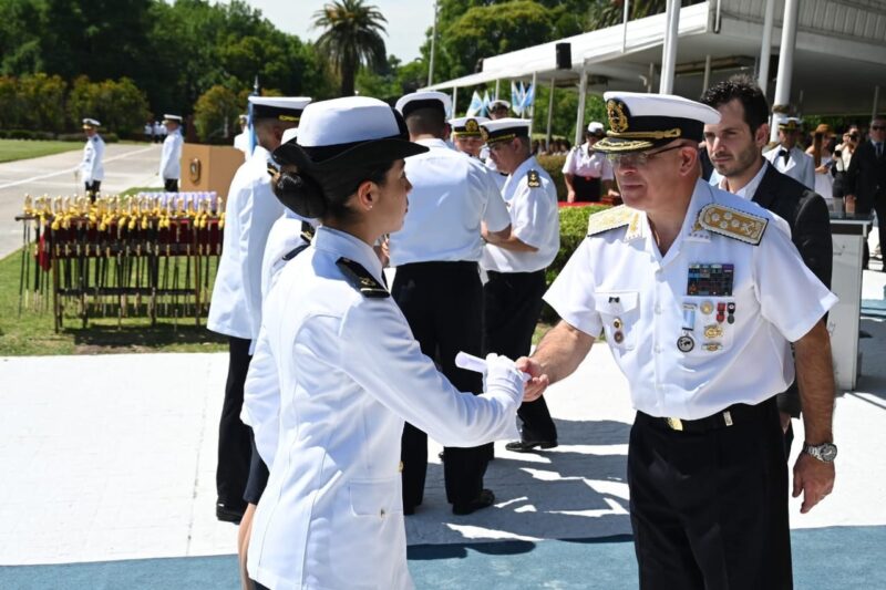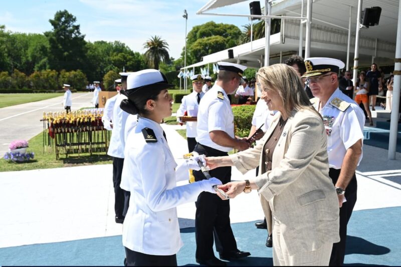 El acto de egresada, con todos los honores, se realizó en la Escuela de Oficiales de la Prefectura Naval Argentina en Zárate, provincia de Buenos Aires, a fin de 2025.