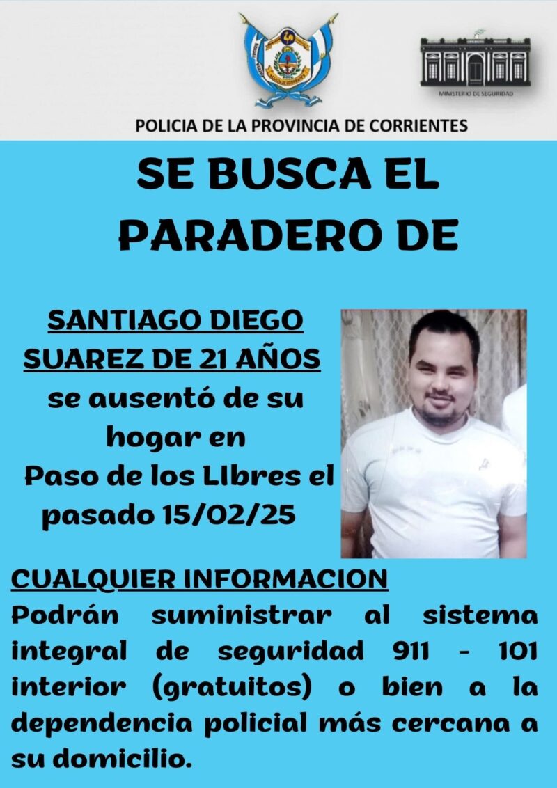 “Desde el primer momento en que se tomó conocimiento de la ausencia del ciudadano Diego Santiago Suárez, de 21 años de edad, domiciliado en la localidad de Paso de los Libres y quien se habría ausentado de su hogar el 15-02-25, la Policía de Corrientes intensificó de manera inmediata el operativo de búsqueda, articulando recursos y personal especializado, la cual se sigue realizando”, explicaron desde la Jefatura.