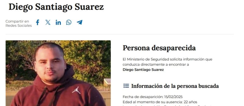 “Desde el primer momento en que se tomó conocimiento de la ausencia del ciudadano Diego Santiago Suárez, de 21 años de edad, domiciliado en la localidad de Paso de los Libres y quien se habría ausentado de su hogar el 15-02-25, la Policía de Corrientes intensificó de manera inmediata el operativo de búsqueda, articulando recursos y personal especializado, la cual se sigue realizando”, explicaron desde la Jefatura.