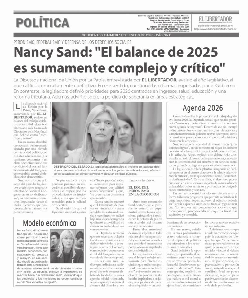 La diputada nacional de Unión por la Patria, Nancy Sand, entrevistada por EL LIBERTADOR, realizó un balance del trabajo legislativo desarrollado durante el último año en la Cámara de Diputados de la Nación, al que definió como «complejo y crítico».