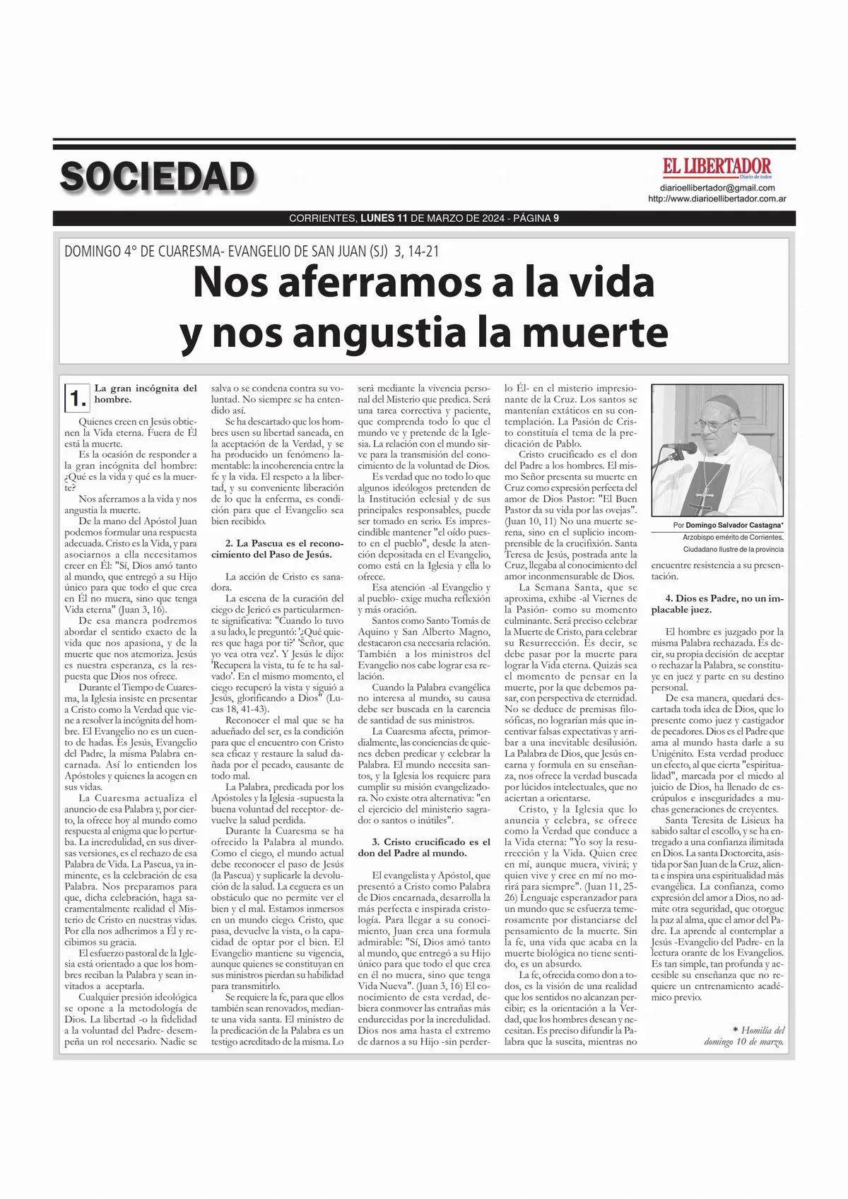 La Semana Santa, que se aproxima, exhibe -al Viernes de la Pasión- como su momento culminante. Será preciso celebrar la Muerte de Cristo, para celebrar su Resurrección. Es decir, se debe pasar por la muerte para lograr la Vida eterna. Quizás sea el momento de pensar en la muerte, por la que debemos pasar, con perspectiva de eternidad. No se deduce de premisas filosóficas, no lograrían más que incentivar falsas expectativas y arribar a una inevitable desilusión. La Palabra de Dios, que Jesús encarna y formula en su enseñanza, nos ofrece la verdad buscada por lúcidos intelectuales, que no aciertan a orientarse.