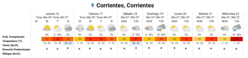El SMN informó que la ciudad de Corrientes tendrá para hoy 38° de máxima y 22° de mínima, con cielo algo nublado. Las altas temperaturas se mantendrán hasta el domingo, cuando estiman probabilidades de lluvias y tormentas dispersas con leve disminución de la temperatura.