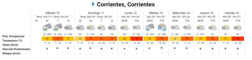 Pro otro lado, para la capital provincial se esperan temperaturas de entre 24° y 31°, con cielo nublado durante todo el día. Entre la mañana y la tarde, las probabilidades de tormentas asiladas ascienden a 40 por ciento.