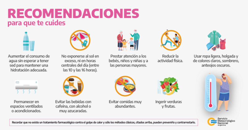 Entre las recomendaciones mencionan las de evitar salir en horarios de mucho sol, usar ropa liviana y clara, tomar mucha agua, permanecer en ambientes muy bien ventilados y prestar especial atención a los bebés y adultos mayores o personas con alguna patología de base. También se recomienda comer alimentos livianos y frescos y evitar las bebidas azucaradas.