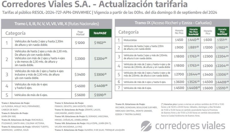 Luego de su publicación en el Boletín Oficial realizada mediante la RESOL-2024-727-APN-DNV#MEC, las nuevas tarifas se verán reflejadas en las estaciones de peaje a partir del domingo 8 de septiembre, a las 00 horas.