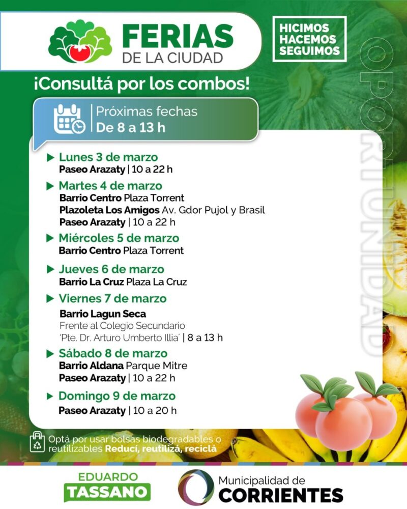 El lunes 3, los feriantes estarán el paseo costero. Y en ese lugar se repetirá el martes 4, a los que se suman las sedes tradicionales de plaza Torrent-San Lorenzo y Bolívar- y plaza Los Amigos del barrio Libertad, frente a la escuela Nº6 por la calle Brasil.