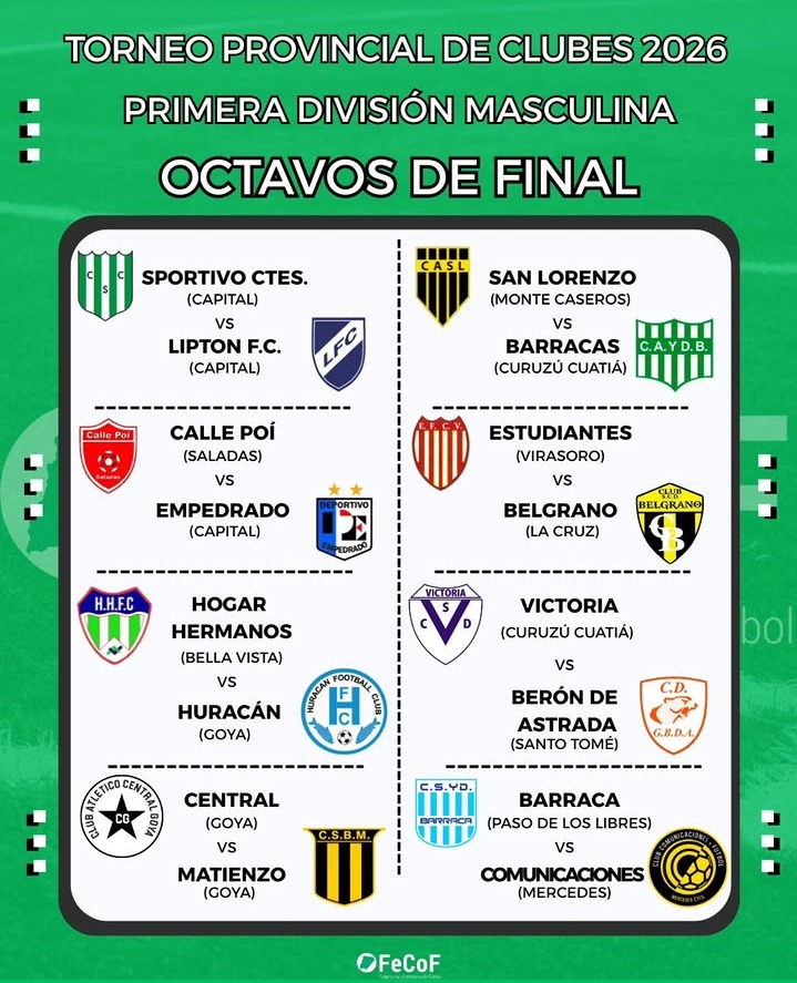 Sportivo Corrientes vs Lipton; Calle Poí vs Deportivo Empedrado; Hogar Hermanos (Bella Vista) vs Huracán (Goya) y Central Goya vs Matienzo en duelos de goyanos por un lado de la llave. De este lote de ocho equipos saldrá uno de los finalistas de esta edición 2026.