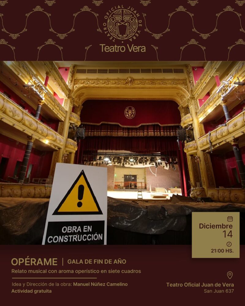 La Gala de Fin de Año será de acceso libre y gratuito, además de poder apreciarse el estreno de “Opérame” mediante streaming, para garantizar un alcance global dada la importancia que tiene la obra concebida por Nuñez Camelino en torno al Vera, al ser material inédito y profesionalizante para los artistas convocados, además de generar ingresos económicos al sector cultural público e independiente.