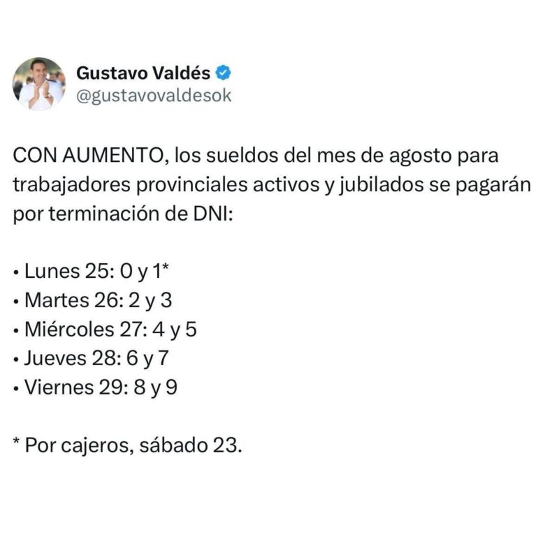 A través de sus redes sociales, @gustavovaldesok, el primer mandatario de Corrientes Gustavo Valdés, informó la ejecución del cronograma de pago de sueldos de agosto, con aumentos del 12%, entre este lunes 25 y viernes 29. Percibirán los agentes de la administración pública provincial, activos, jubilados y pensionados correntinos.