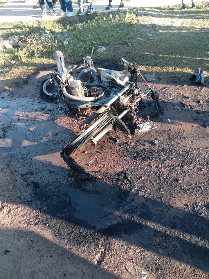 Un automóvil persiguió y chocó a la motocicleta con dos ocupantes acusados de haber robado otra motocicleta, estos cayeron y uno de ellos huyó del lugar. A continuación incendiaron la Honda New Titán, en la que se trasladaban los fugitivos.