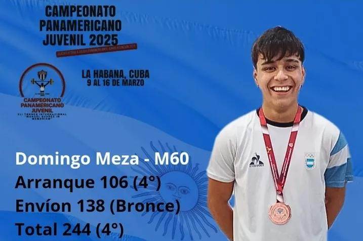 Integrando la selección argentina, el atleta correntino, Domingo Meza, de 17 años, cumplió una destacada actuación en el Campeonato Panamericano Juvenil de Levantamiento de Pesas, desarrollado en La Habana, Cuba.