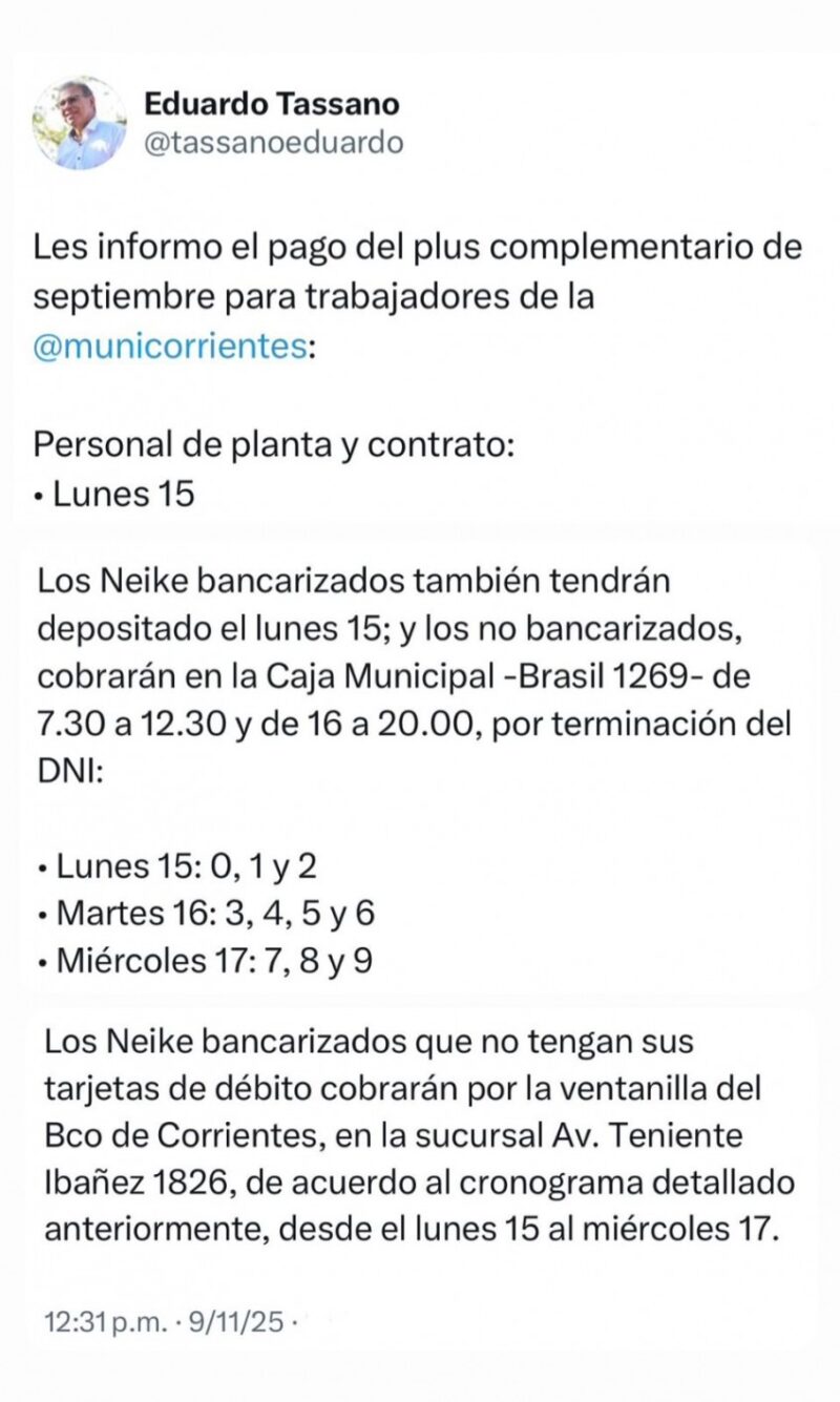 El cronograma se extenderá hasta el miércoles 17 de septiembre, según lo anunció el intendente Eduardo Tassano a través de sus redes sociales.