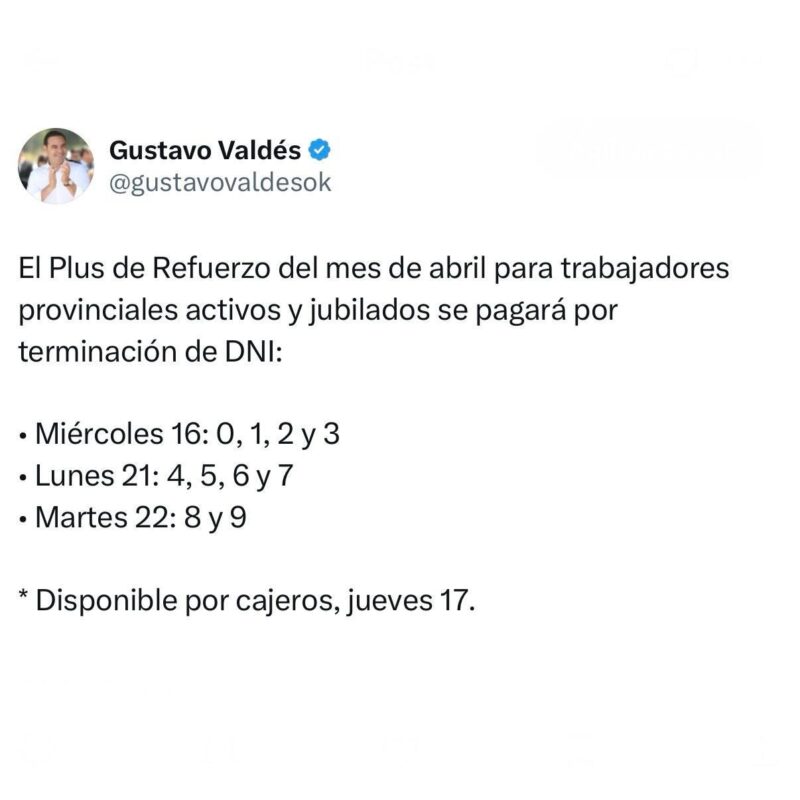 Valdés, a través de sus redes sociales -@gustavovaldesok- informó que el miércoles 16, el Gobierno de Corrientes comenzará a abonar el Plus de Refuerzo correspondiente al mes de abril a los agentes activos, jubilados y pensionados de la administración pública provincial, por terminación de DNI.