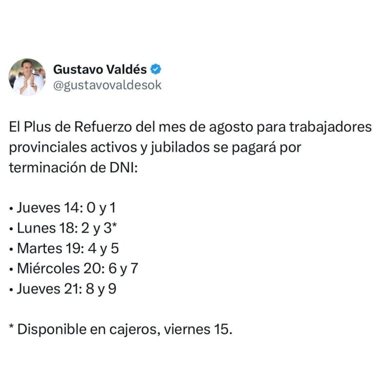 A través de sus redes sociales, @gustavovaldesok, el primer mandatario de Corrientes Gustavo Valdés informó el cronograma de pago del Plus de Refuerzo de $100.000, correspondiente a este mes de agosto. La liquidación del beneficio salarial comienza este jueves 14 y se extiende hasta el 21 próximo.