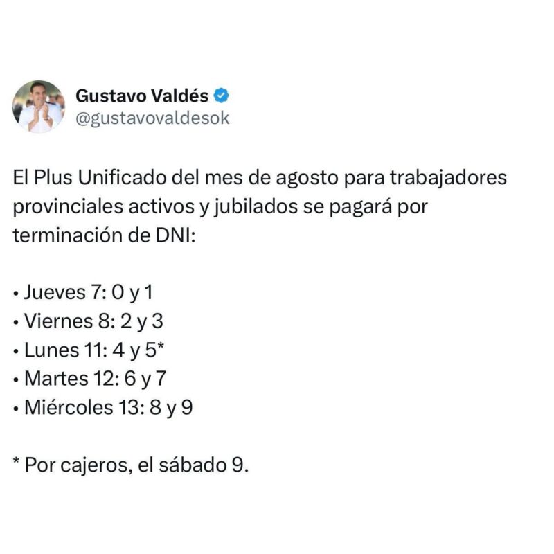 A través de sus redes sociales, @gustavovaldesok, el primer mandatario de Corrientes Gustavo Valdés informó el cronograma de pago del Adicional Remunerativo Mensual (Plus Unificado) de $110.000, correspondiente a este mes de agosto. La liquidación del beneficio salarial comienza este jueves 7 y se extiende hasta el miércoles 13.