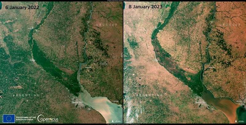 Fue publicada en Twitter, donde en 2021 ya habían alertado por la cruda bajante del río Paraná y la sequía en sus márgenes. Ahora, el panorama se amplió peligrosamente. La publicación fue acompañada de dos tomas satelitales, una obtenida el 6 de enero de 2022 y otra recientemente, hace sólo días, producto del monitoreo del programa Copernicus, gracias al satélite Sentinel 3.