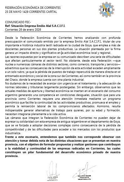 La Federación Económica de Corrientes expresó su profunda preocupación ante el comunicado emitido por la empresa Emilio Alal, titular de una industria textil de histórica presencia en la ciudad de Goya.